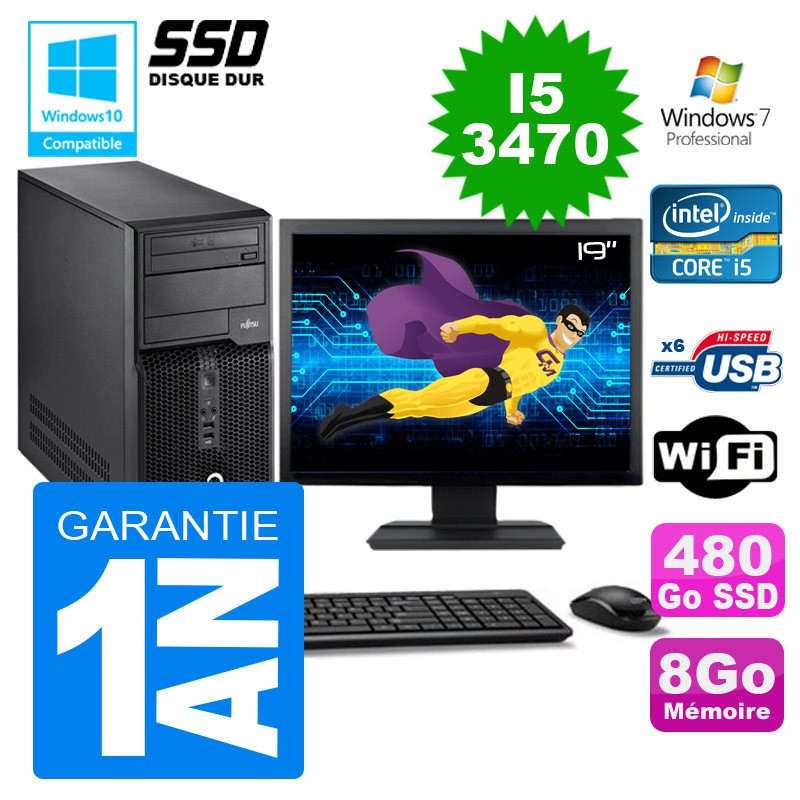 PC Tour Fujitsu Esprimo P400 I5-3470 RAM 8Go Disque 480 Go SSD Wifi W7 Ecran 19"