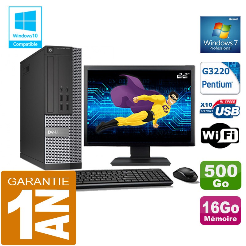 PC DELL 7020 SFF - Intel Pentium G3220 3.0GHz (3 Mo de cache) - 16 Go DDR3 - Disque Dur 500 Go - Graveur DVD - Clé WIFI USB - Windows 7 Pro - Pack Clavier + Souris + Ecran 22" ( Marque et modèle selon arrivages) - Garantie = 1 an.