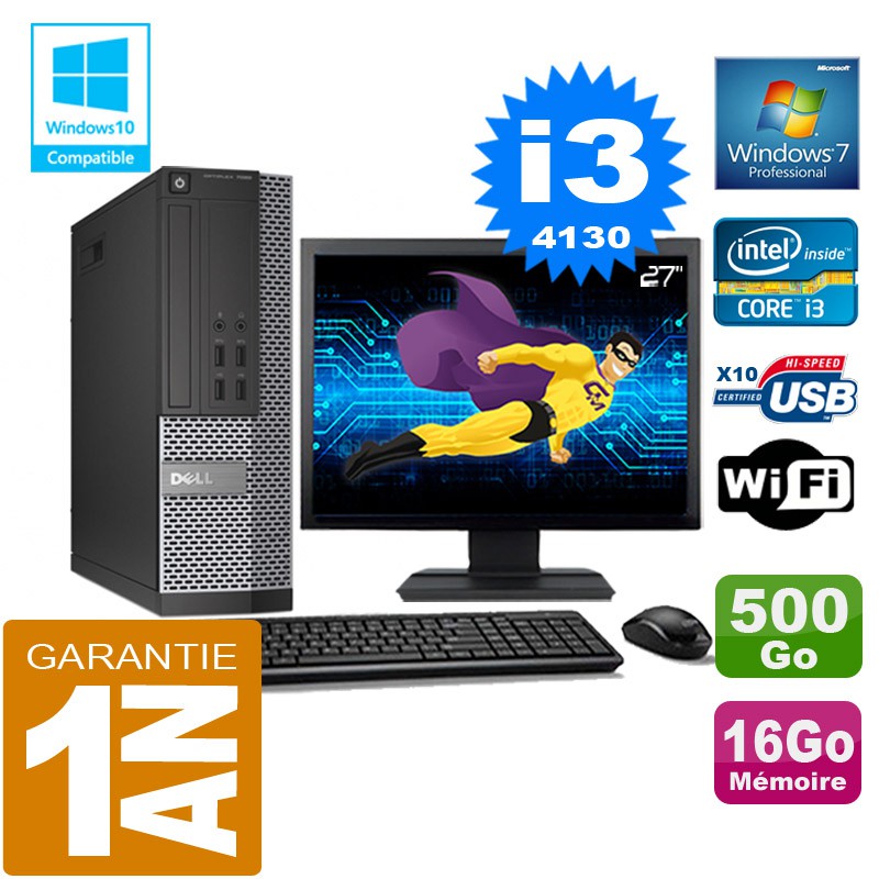 PC DELL 7020 SFF Core I3-4130 Ram 16Go Disque 500 Go Wifi W7 Ecran 27"