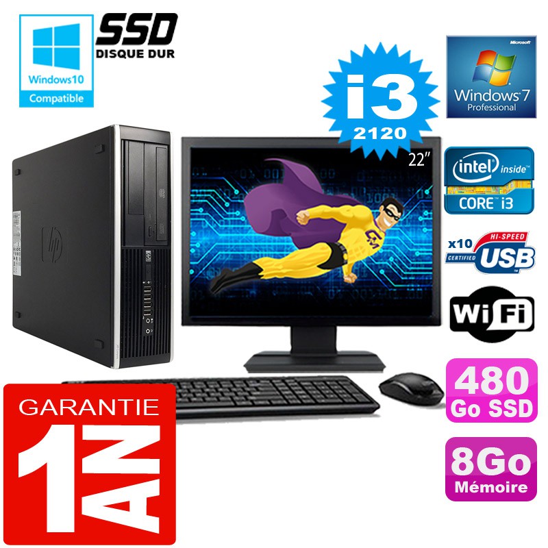 PC HP Compaq 8300 SFF Core I3-2120 Ram 8Go Disque 480 Go SSD Wifi W7 Ecran 22"