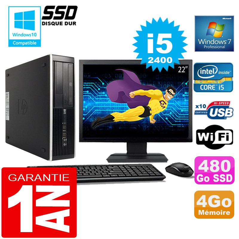PC HP Compaq 8300 SFF Core I5-2400 Ram 4Go Disque 480 Go SSD Wifi W7 Ecran 22"