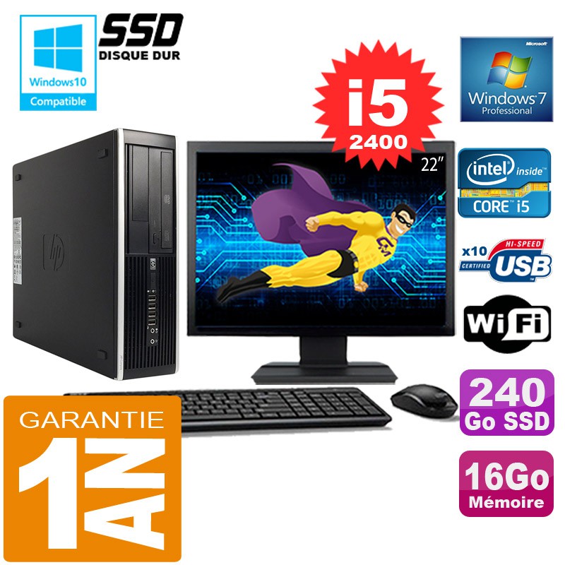 PC HP Compaq 8300 SFF Core I5-2400 Ram 16Go Disque 240 Go SSD Wifi W7 Ecran 22"