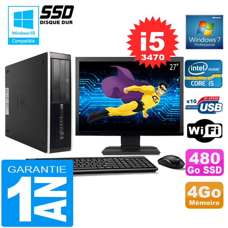 PC HP Compaq 8300 SFF Core I5-3470 Ram 4Go Disque 480 Go SSD Wifi W7 Ecran 27"