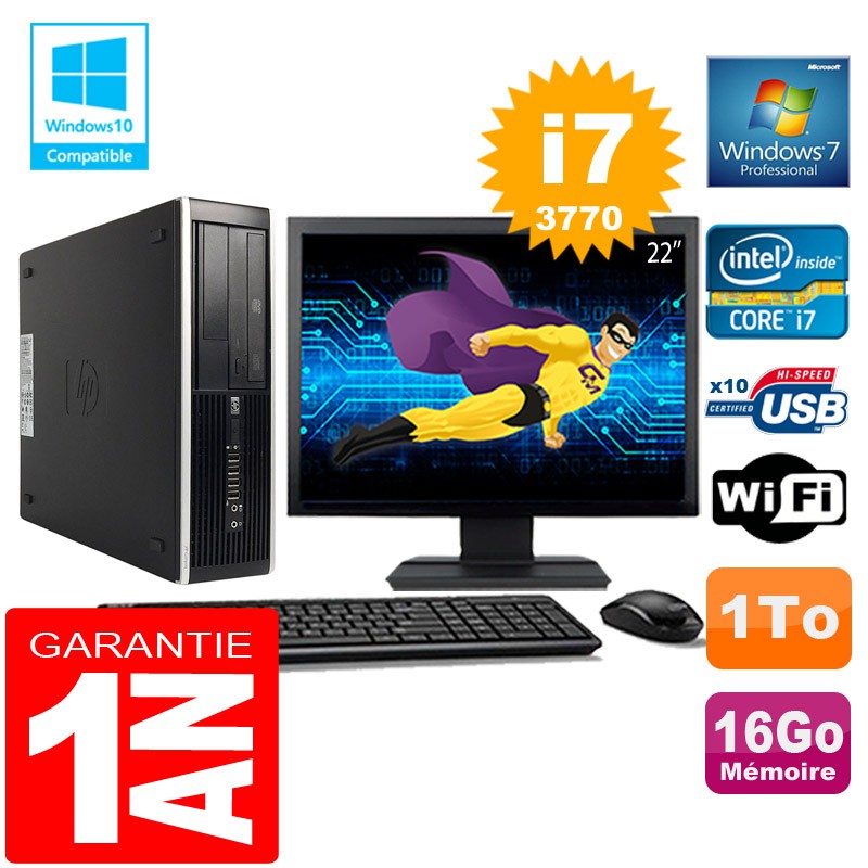 PC HP Compaq 8300 SFF Core I7-3770 Ram 16Go Disque 1 To Wifi W7 Ecran 22"