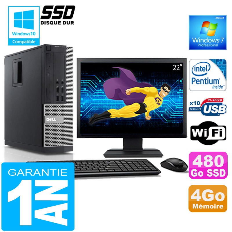 PC DELL 990 SFF Intel G840 Ram 4Go Disque 480 Go SSD Wifi W7 Ecran 22"