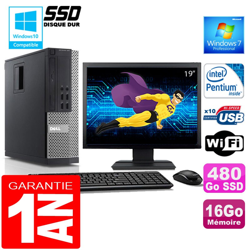 PC DELL 990 SFF - Intel®Pentium® G840 2,8Ghz (3 Mo de cache) - 16 Go DDR3 - Disque Dur 480Go SSD - Graveur DVD - Clé WIFI USB - Windows 7 Pro - Pack Clavier + Souris + Ecran 19" ( Marque et modèle selon arrivages) - Garantie = 1 an.