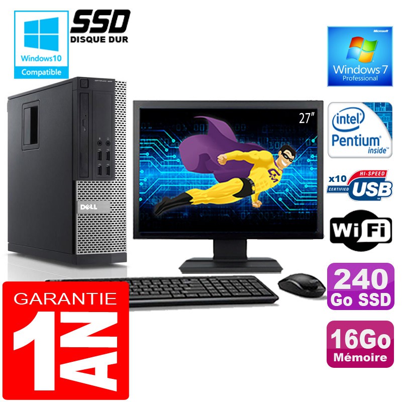 PC DELL 990 SFF - Intel®Pentium® G840 2,8Ghz (3 Mo de cache) - 16 Go DDR3 - Disque Dur 240 Go SSD - Graveur DVD - Clé WIFI USB - Windows 7 Pro - Pack Clavier + Souris + Ecran 27" ( Marque et modèle selon arrivages) - Garantie = 1 an.