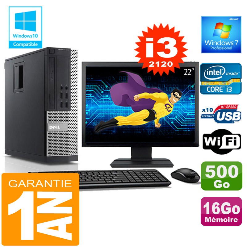 PC DELL 990 SFF Core I3-2120 Ram 16Go Disque 500 Go Wifi W7 Ecran 22"