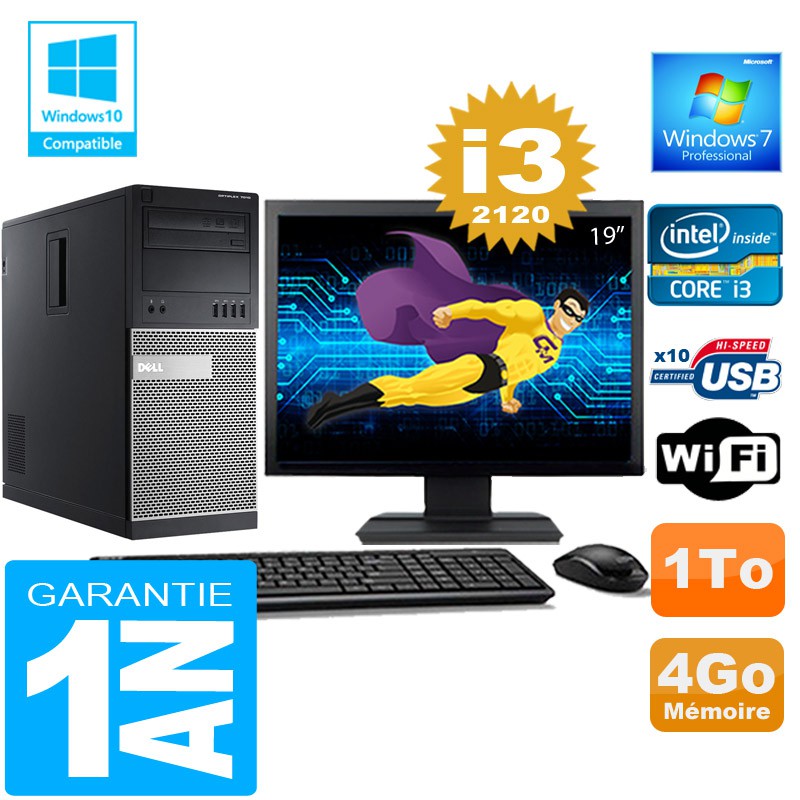 PC Tour DELL 7010 MT - Intel® Core I3-2120 3,3Ghz (3 Mo de cache) - 4 Go DDR3 - Disque Dur 1To - Graveur DVD - Clé WIFI USB - Windows 7 Pro - Pack Clavier + Souris + Ecran 19" ( Marque et modèle selon arrivages) - Garantie = 1 an.