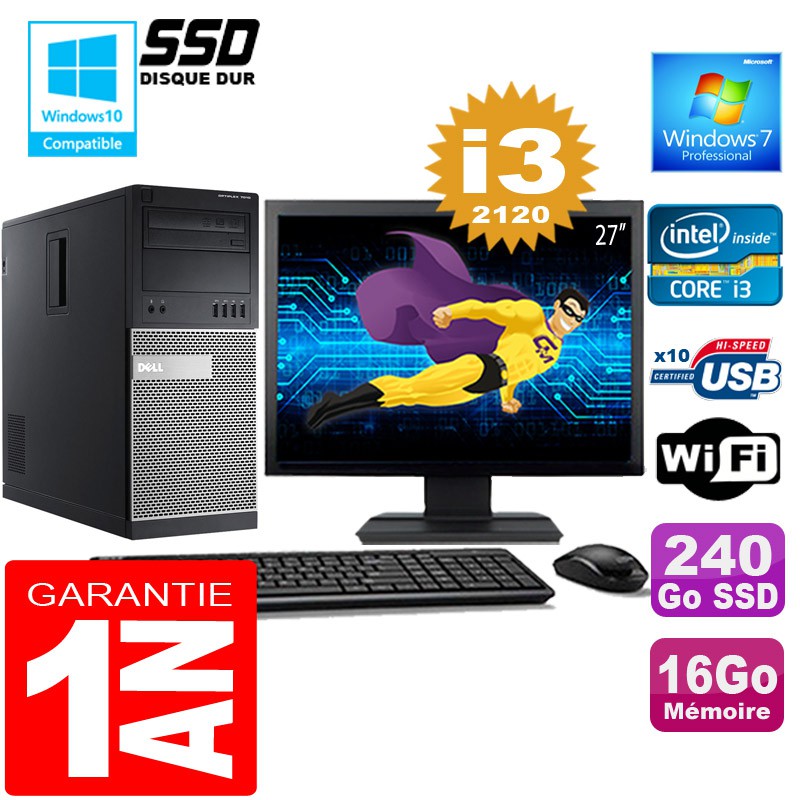 PC Tour DELL 7010 MT - Intel® Core I3-2120 3,3Ghz (3 Mo de cache) - 16 Go DDR3 - Disque Dur 240 Go SSD - Graveur DVD - Clé WIFI USB - Windows 7 Pro - Pack Clavier + Souris + Ecran 27" ( Marque et modèle selon arrivages) - Garantie = 1 an.