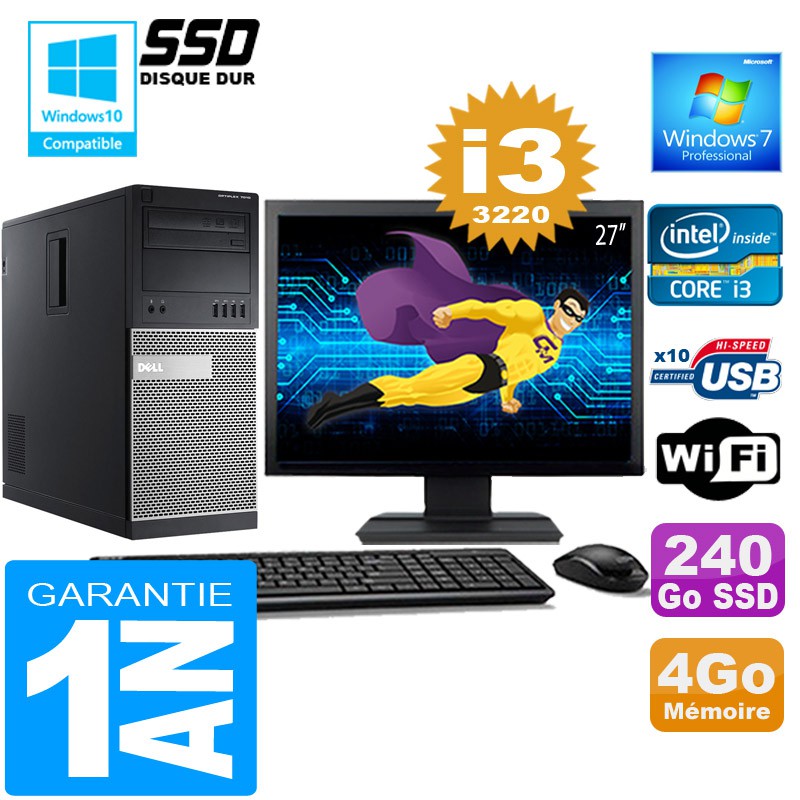 PC Tour DELL 7010 Core I3-3220 Ram 4Go Disque 240 Go SSD Wifi W7 Ecran 27"