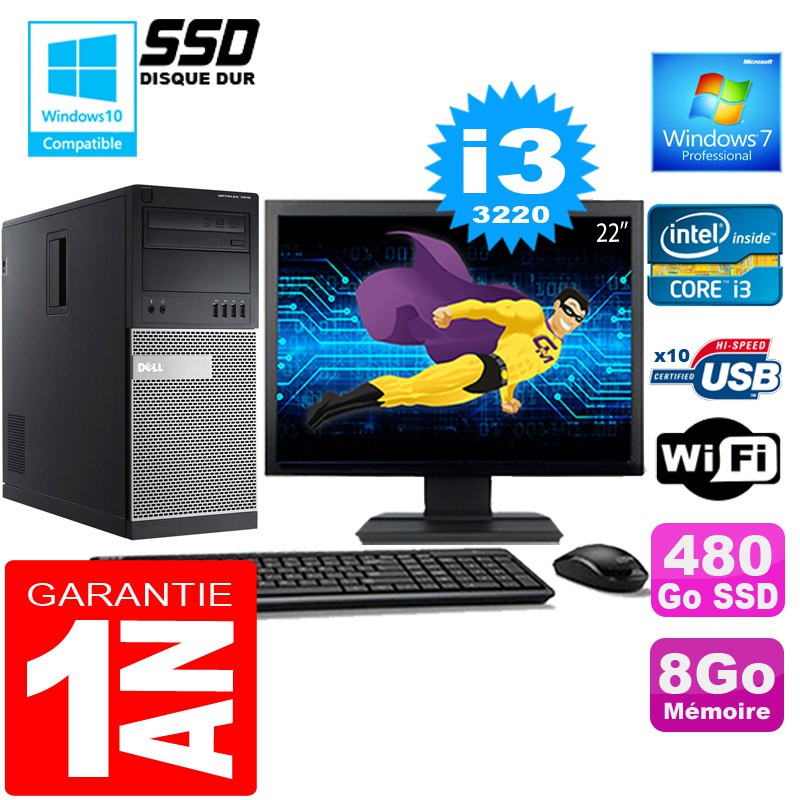 PC Tour DELL 7010 MT - Intel® Core I3-3220 3.3Ghz (3 Mo de cache) - 8 Go DDR3 - Disque Dur 480 Go SSD - Graveur DVD - Clé WIFI USB - Windows 7 Pro - Pack Clavier + Souris + Ecran 22" ( Marque et modèle selon arrivages) - Garantie = 1 an.