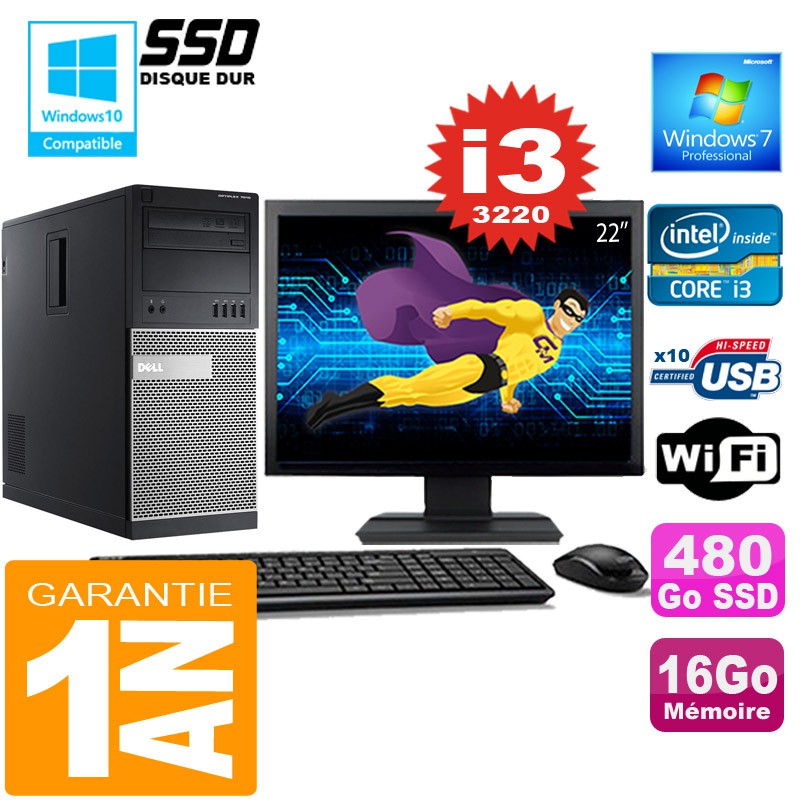 PC Tour DELL 7010 MT - Intel® Core I3-3220 3.3Ghz (3 Mo de cache) - 16 Go DDR3 - Disque Dur 480 Go SSD - Graveur DVD - Clé WIFI USB - Windows 7 Pro - Pack Clavier + Souris + Ecran 22" ( Marque et modèle selon arrivages) - Garantie = 1 an.