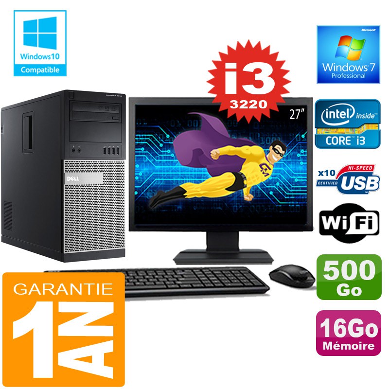 PC Tour DELL 7010 Core I3-3220 Ram 16Go Disque 500 Go Wifi W7 Ecran 27"