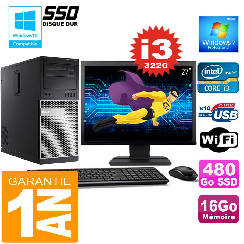 PC Tour DELL 7010 MT - Intel® Core I3-3220 3.3Ghz (3 Mo de cache) - 16 Go DDR3 - Disque Dur 480 Go SSD - Graveur DVD - Clé WIFI USB - Windows 7 Pro - Pack Clavier + Souris + Ecran 27" ( Marque et modèle selon arrivages) - Garantie = 1 an.