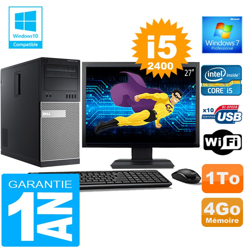 PC Tour DELL 7010 MT - Intel® Core I5-2400 3,1Ghz (6 Mo de cache) - 4 Go DDR3 - Disque Dur 1To - Graveur DVD - Clé WIFI USB - Windows 7 Pro - Pack Clavier + Souris + Ecran 27" ( Marque et modèle selon arrivages) - Garantie = 1 an.
