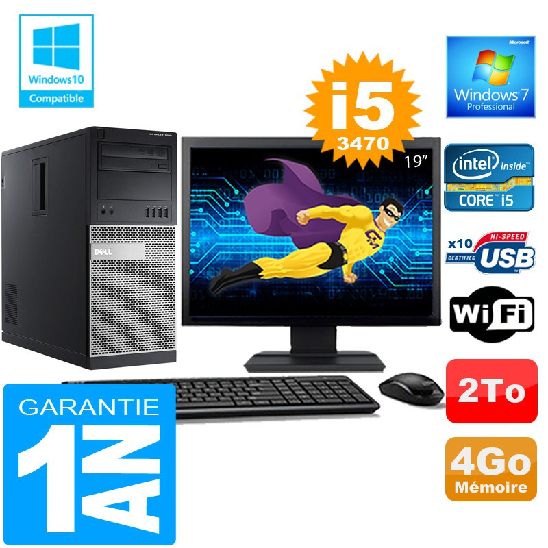 PC Tour DELL 7010 MT - Intel® Core I5-3470 3.2Ghz (6 Mo de cache) - 4 Go DDR3 - Disque Dur 2To - Graveur DVD - Clé WIFI USB - Windows 7 Pro - Pack Clavier + Souris + Ecran 19" ( Marque et modèle selon arrivages) - Garantie = 1 an.