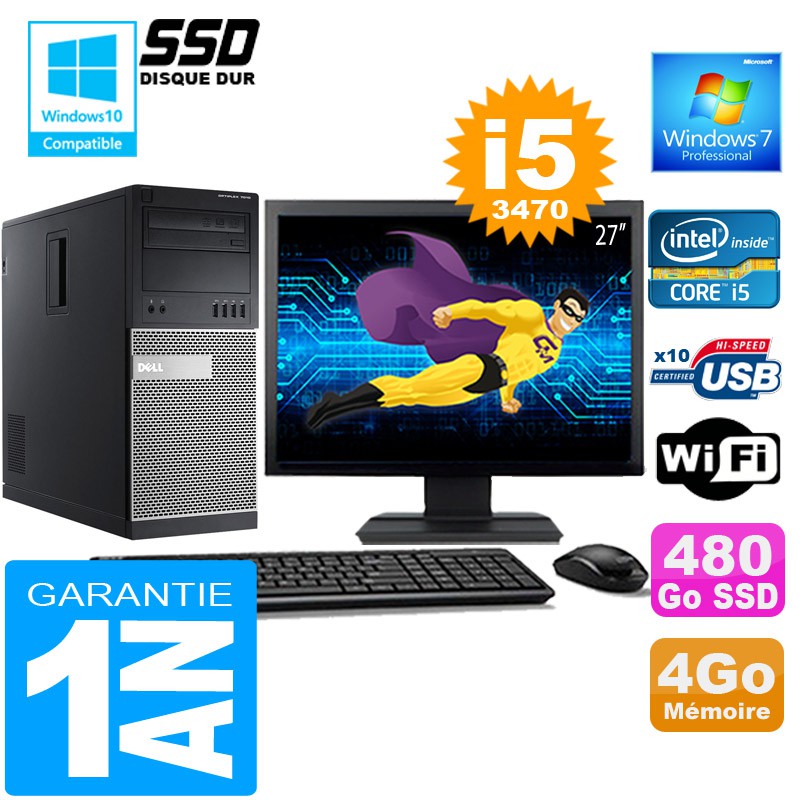 PC Tour DELL 7010 MT - Intel® Core I5-3470 3.2Ghz (6 Mo de cache) - 4 Go DDR3 - Disque Dur 480 Go SSD - Graveur DVD - Clé WIFI USB - Windows 7 Pro - Pack Clavier + Souris + Ecran 27" ( Marque et modèle selon arrivages) - Garantie = 1 an.