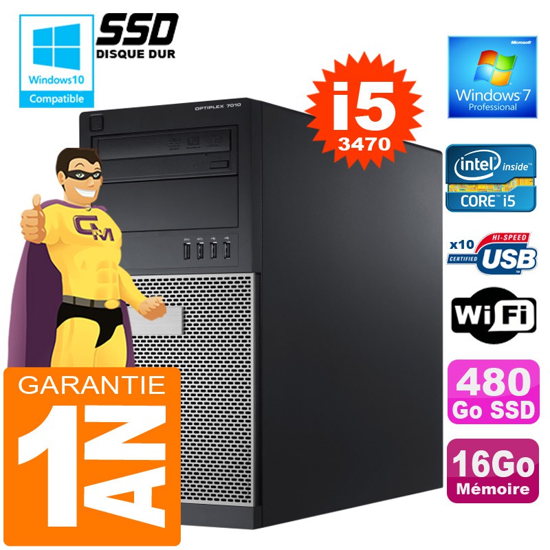 PC Tour DELL 7010 MT - Intel® Core I5-3470 3.2Ghz (6 Mo de cache) -16Go DDR3 - Disque Dur 480 Go SSD - Graveur DVD - Clé WIFI USB - Windows 7 Pro - Garantie = 1 an.