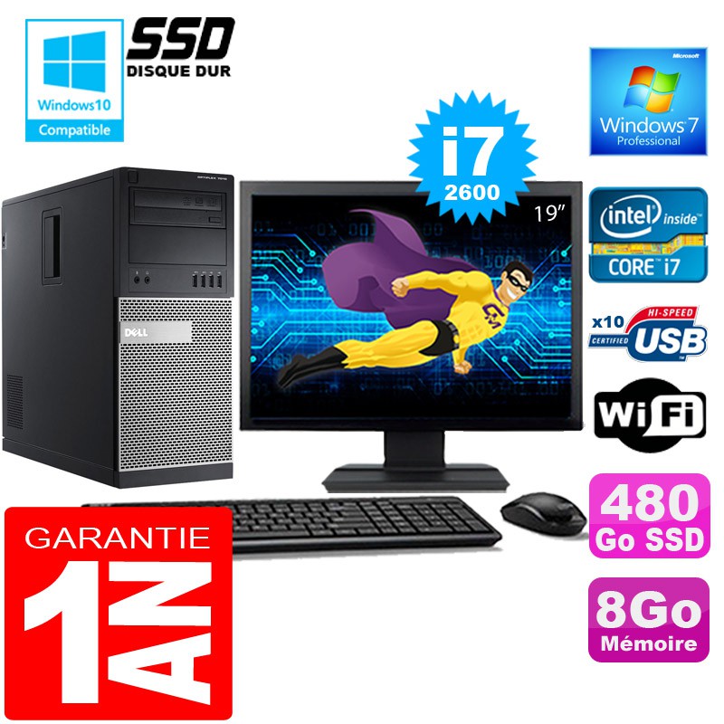 PC Tour DELL 7010 MT - Intel® Core I7-2600 3,4Ghz (8 Mo de cache) - 8Go DDR3 - Disque Dur 480Go SSD - Graveur DVD - Clé WIFI USB - Windows 7 Pro - Pack Clavier + Souris + Ecran 19" ( Marque et modèle selon arrivages) - Garantie = 1 an.