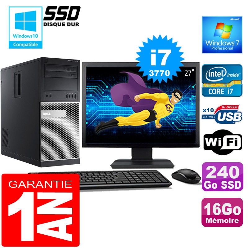 PC Tour DELL 7010 Core I7-3770 Ram 16Go Disque 240 Go SSD Wifi W7 Ecran 27"