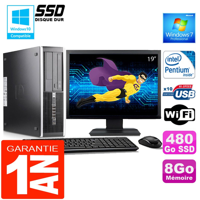 PC HP Compaq 6000 Pro SFF - Intel® Pentium® E6300 2,80Ghz (2 Mo de cache) - 8 Go DDR3 - Disque Dur 480Go SSD - Graveur DVD - Clé WIFI USB - Windows 7 Pro - Pack Clavier + Souris + Ecran 19" ( Marque et modèle selon arrivages) - Garantie = 1 an.