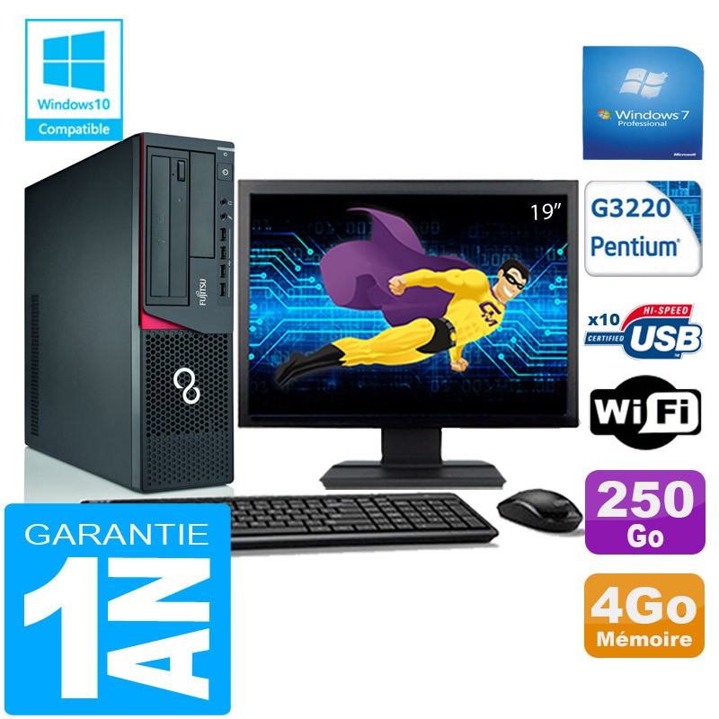 PC Fujitsu Esprimo E720 E85+ SFF G3220 RAM 4Go Disque 500 Go Wifi W7 Ecran 19"