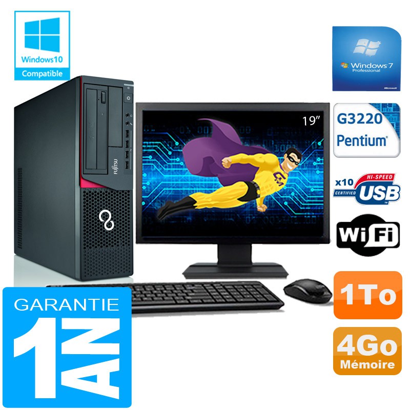 PC Fujitsu Esprimo E720 E85+ SFF G3220 RAM 4Go Disque 1 To Wifi W7 Ecran 19"