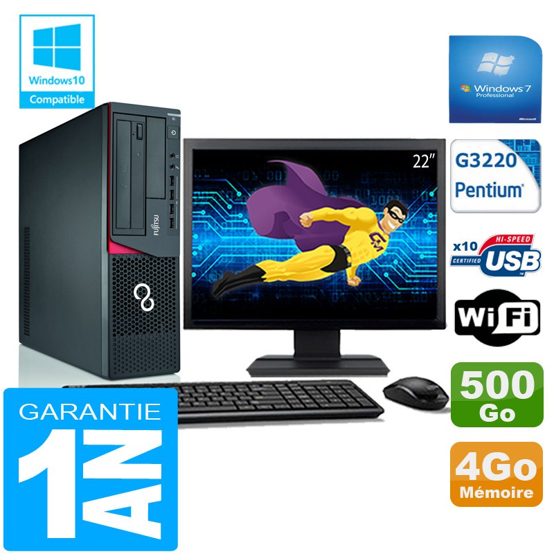 PC Fujitsu Esprimo E720 E85+ SFF G3220 RAM 4Go Disque 500 Go Wifi W7 Ecran 22"