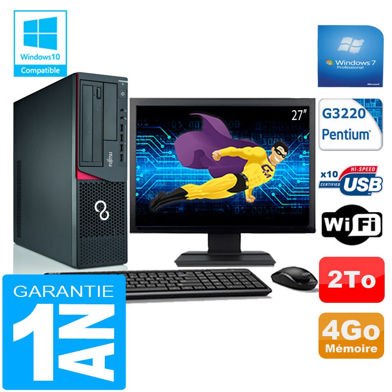 PC Fujitsu Esprimo E720 E85+ SFF G3220 RAM 4Go Disque 2 To Wifi W7 Ecran 27"