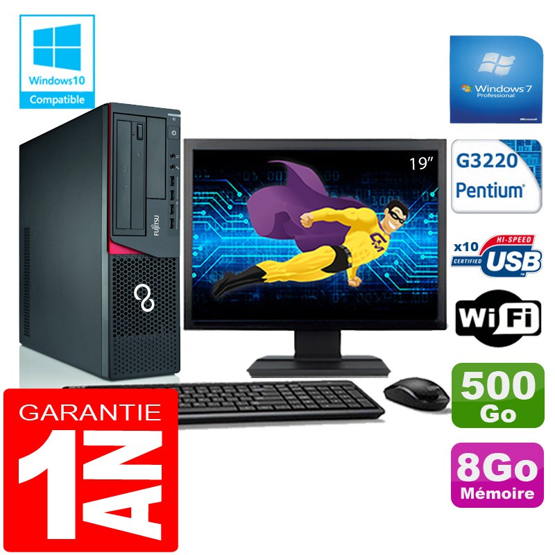 PC Fujitsu Esprimo E720 E85+ SFF G3220 RAM 8Go Disque 500 Go Wifi W7 Ecran 19"