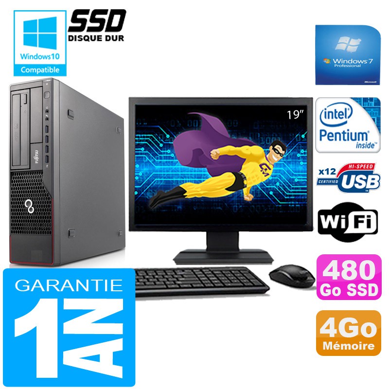 PC Fujitsu Esprimo E700 E90+ SFF G840 4Go Disque 480 Go SSD Wifi W7 Ecran 19"