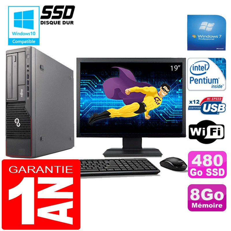 PC Fujitsu Esprimo E700 E90+ SFF G840 8Go Disque 480 Go SSD Wifi W7 Ecran 19"