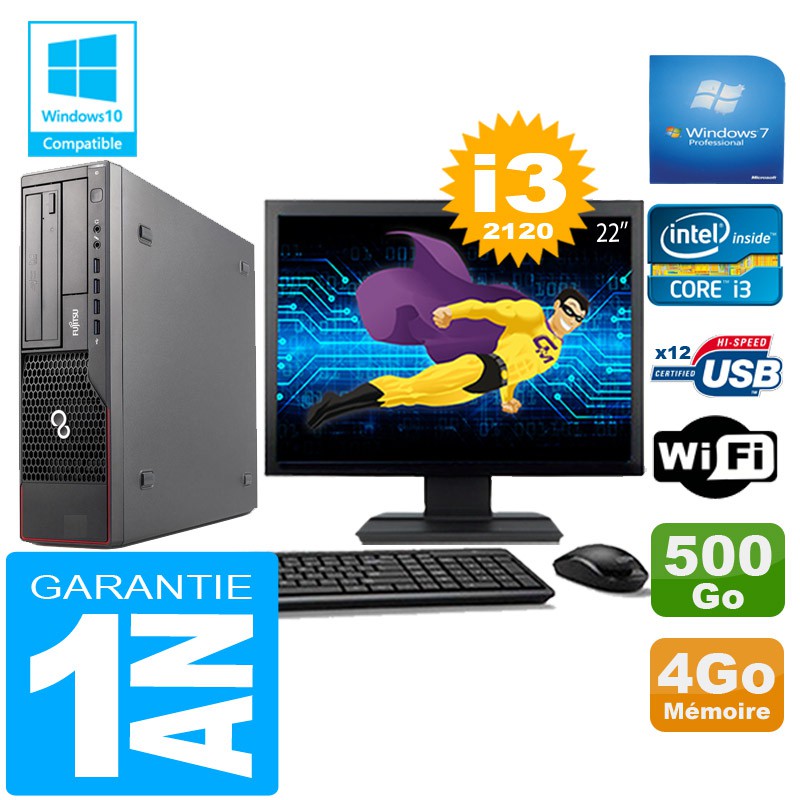 PC Fujitsu Esprimo E700 E90+ SFF Core I3-2120 4Go Disque 500Go Wifi W7 Ecran 22"