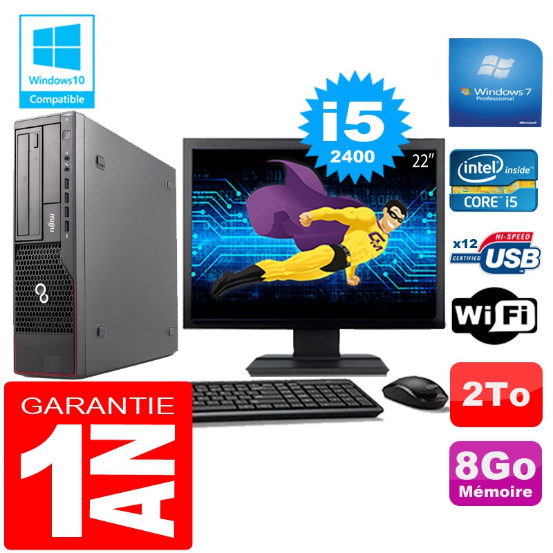 PC Fujitsu Esprimo E700 E90+ SFF Core I5-2400 8Go Disque 2 To Wifi W7 Ecran 22"
