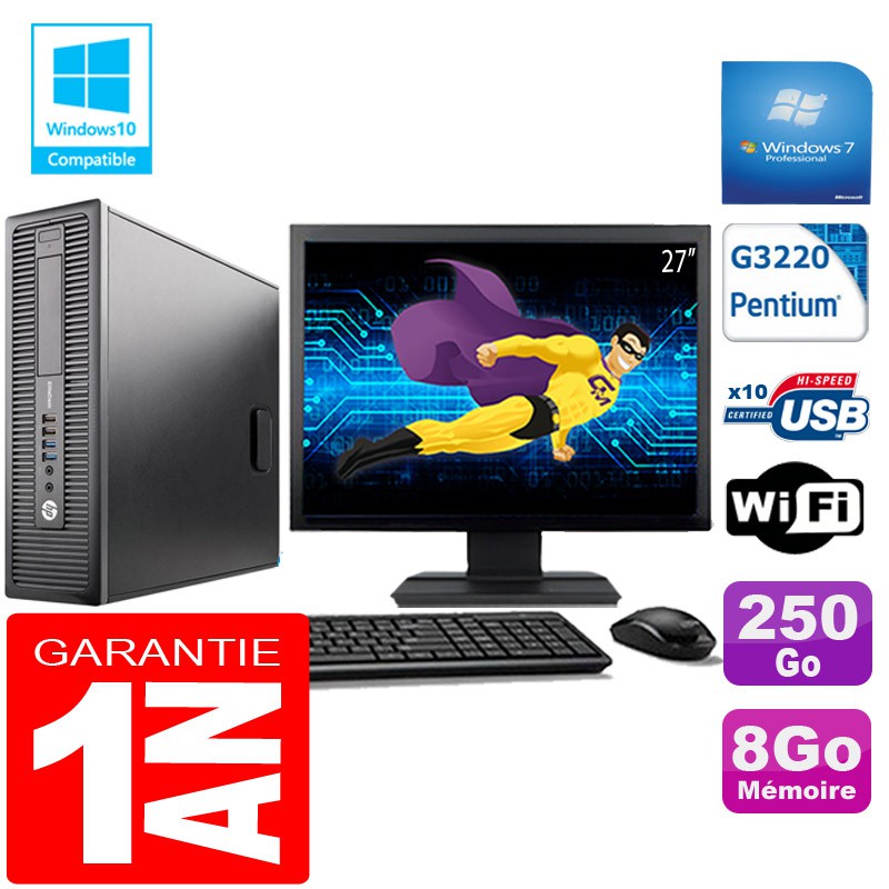 PC HP EliteDesk 800 G1 SFF - Intel Pentium G3220 3.0GHz (3 Mo de cache) - 8Go DDR3 - Disque Dur 250Go - Graveur DVD - Clé WIFI USB - Windows 7 Pro - Pack Clavier + Souris + Ecran 27" ( Marque et modéles selon arrivages) - Garantie = 1 an.