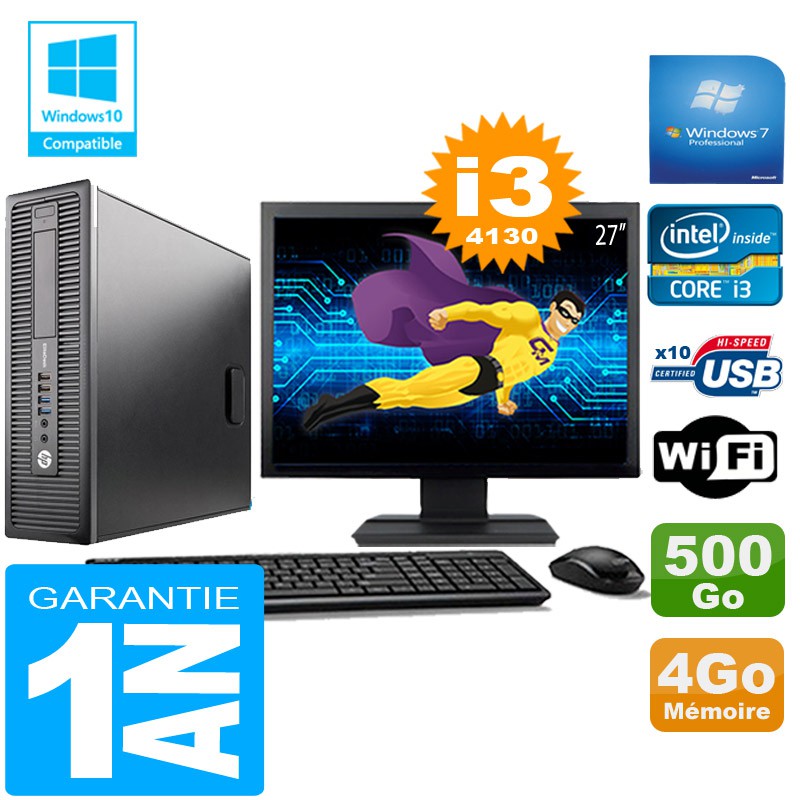 PC HP EliteDesk 800 G1 SFF Core I3-4130 4Go Disque 500 Go Wifi W7 Ecran 27"