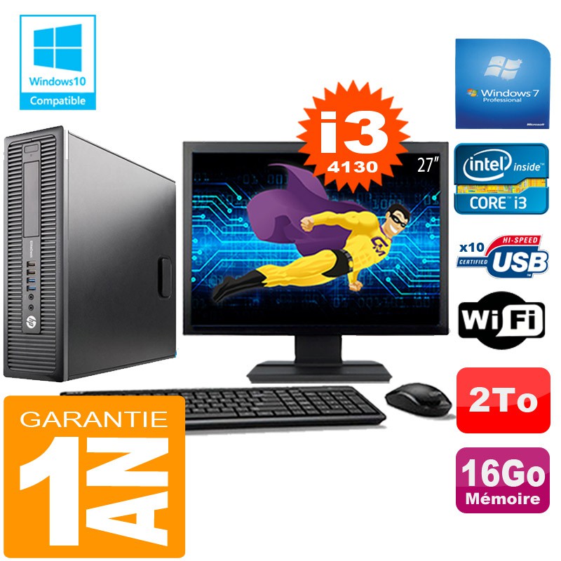 PC HP EliteDesk 800 G1 SFF Core I3-4130 16Go Disque 2 To Wifi W7 Ecran 27"