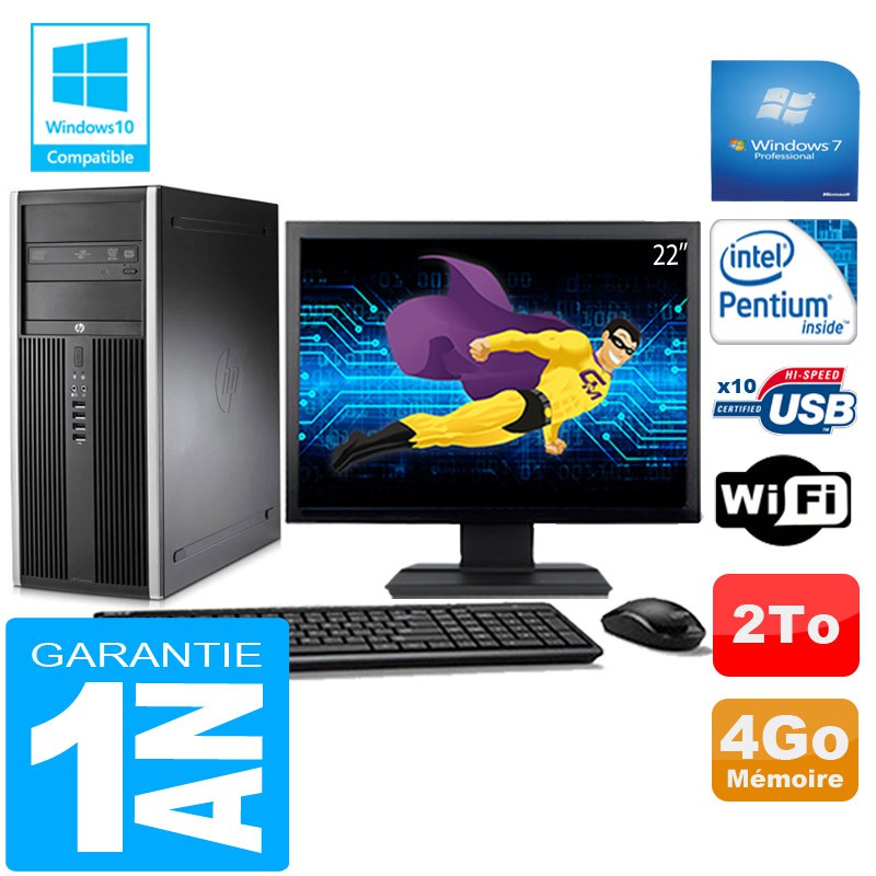 PC Tour HP Compaq Elite 8200 -Intel Pentium G630 2,7Ghz (3 Mo de cache) - 4Go DDR3 - Disque Dur 2To - Graveur DVD - Clé WIFI USB - Windows 7 Pro - Pack Clavier + Souris + Ecran 22" ( Marque et modèle selon arrivages) - Garantie = 1 an.