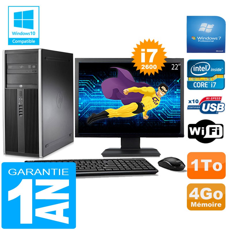 PC Tour HP Compaq 8200 Core I7-2600 Ram 4Go Disque 1 To Wifi W7 Ecran 22"