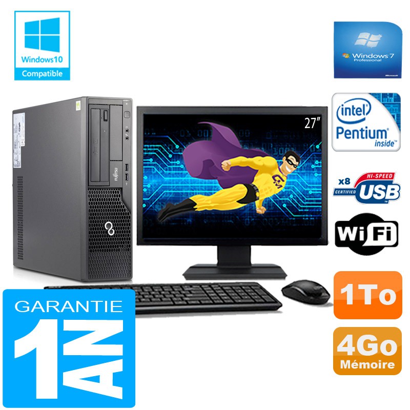 PC Fujitsu Esprimo E500 E85+ SFF - Intel G640 2,80Ghz - 4Go DDR3 - Disque Dur 1To - Graveur DVD - Clé WIFI USB - Windows 7 Pro - Pack Clavier + Souris + Ecran 27" ( Marque et modéles selon arrivages) - Garantie = 1 an.
