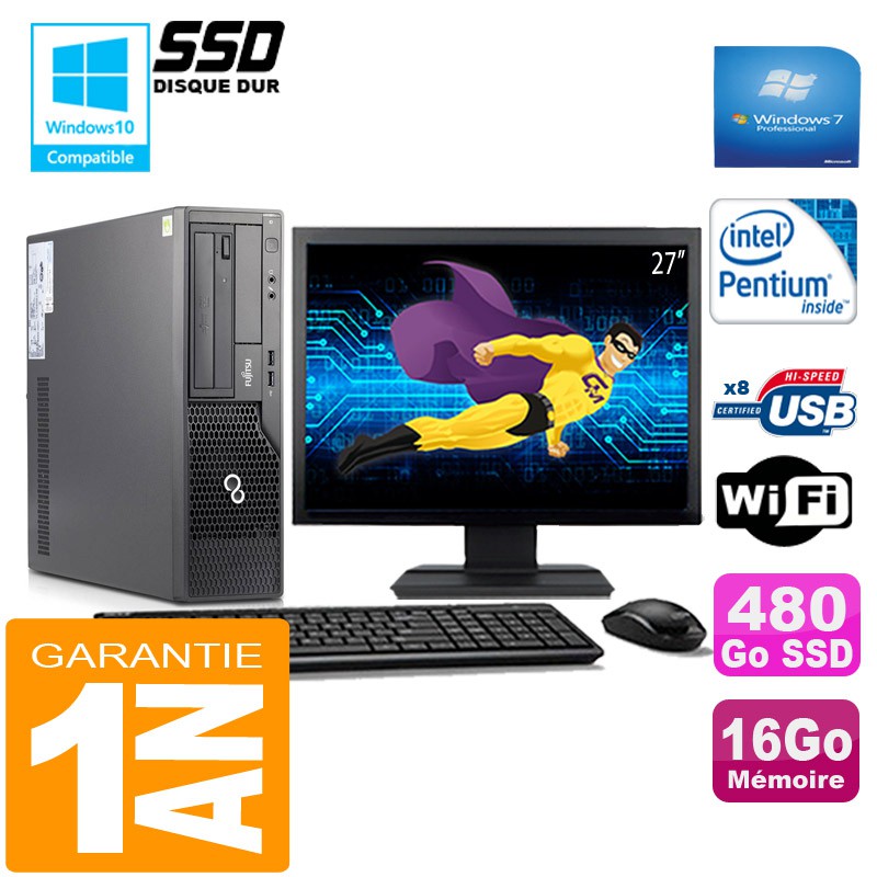 PC Fujitsu Esprimo E500 E85+ SFF - Intel G640 2,80Ghz - 16Go DDR3 - Disque Dur 480 Go SSD - Graveur DVD - Clé WIFI USB - Windows 7 Pro - Pack Clavier + Souris + Ecran 27" ( Marque et modéles selon arrivages) - Garantie = 1 an.