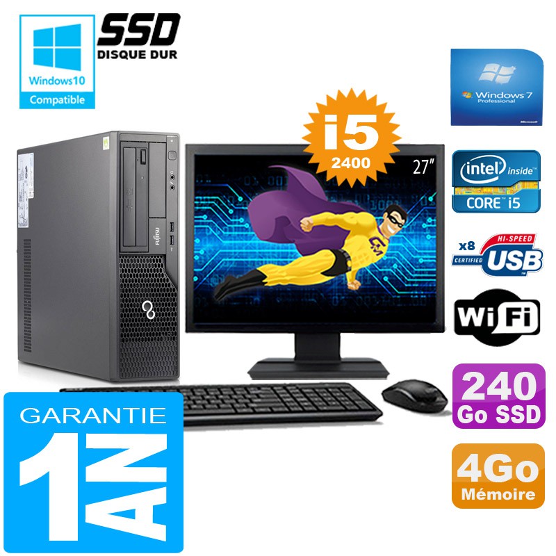 PC Fujitsu Esprimo E500 E85+ SFF - Core I5-2400 3,10Ghz - 4Go DDR3 - Disque Dur 240 Go SSD - Graveur DVD - Clé WIFI USB - Windows 7 Pro - Pack Clavier + Souris + Ecran 27" ( Marque et modéles selon arrivages) - Garantie = 1 an.
