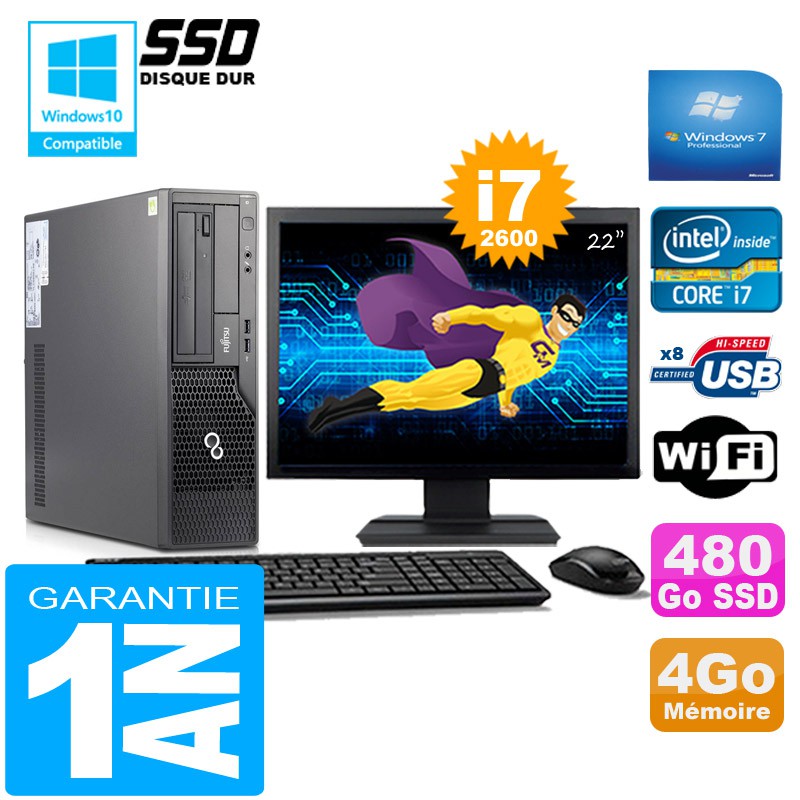 PC Fujitsu Esprimo E500 E85+ SFF - Core I7-2600 3,40Ghz - 4Go DDR3 - Disque Dur 480 Go SSD - Graveur DVD - Clé WIFI USB - Windows 7 Pro - Pack Clavier + Souris + Ecran 22" ( Marque et modéles selon arrivages) - Garantie = 1 an.