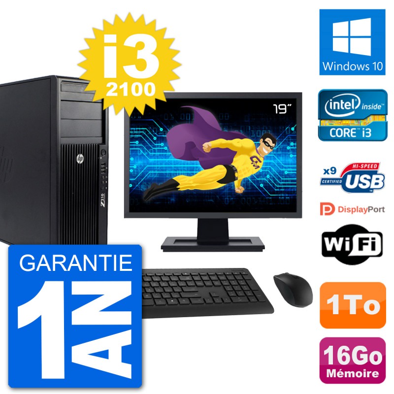 PC Tour HP WorkStation Z210 - Intel Core i3-2100 3.1 Ghz (3 Mo) - 16 Go DDR3 - Disque Dur 3,5" 1 To - Graveur DVD - Clef Wifi USB - Windows 10 - Livré avec Ecran 19" + clavier + souris (Marques et modèles variables) - Garantie 1 an.