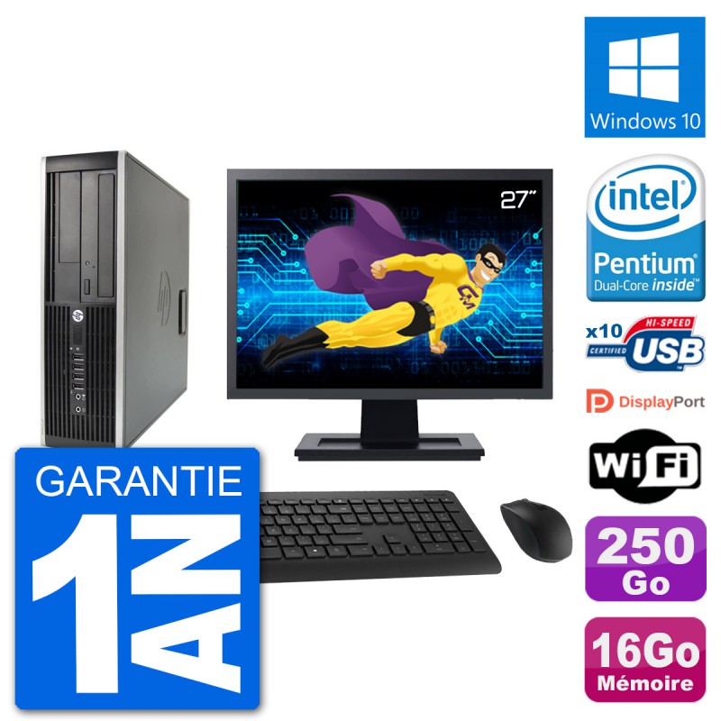 PC HP Compaq 6200 Pro SFF (Slim) - Intel Pentium Dual-Core G630 2.7 Ghz (3 Mo) - 16 Go DDR3 - Disque Dur 3,5" 250 Go - Graveur DVD - Clef Wifi USB - Windows 10 - Livré avec Ecran 27" + clavier + souris (Marques et modèles variables) - Garantie 1 an.