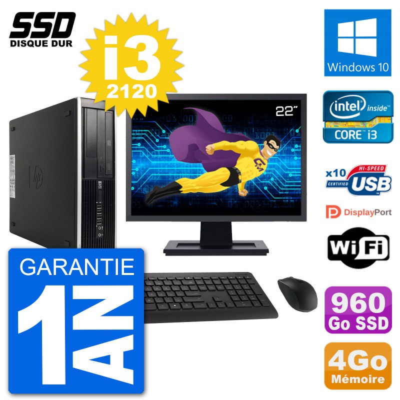 PC HP Compaq 6200 Pro SFF (Slim) - Intel Core i3-2120 3.3 Ghz (3 Mo) - 4 Go DDR3 - Disque Dur SSD 960 Go - Graveur DVD - Clef Wifi USB - Windows 10 - Livré avec Ecran 22" + clavier + souris (Marques et modèles variables) - Garantie 1 an.