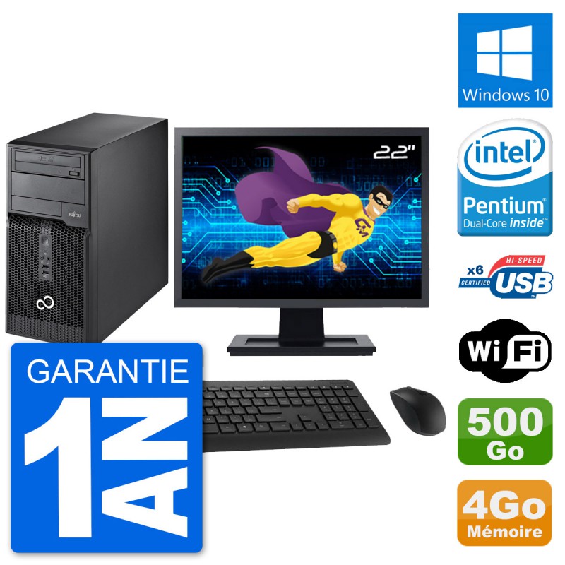 PC Tour Fujitsu P400 - Intel Pentium Dual-Core G630 2.7 Ghz (3 Mo) - 4 Go DDR3 - Disque Dur 3,5" 500 Go - Graveur DVD - Clef Wifi USB - Windows 10 - Livré avec Ecran 22" + clavier + souris (Marques et modèles variables) - Garantie 1 an.