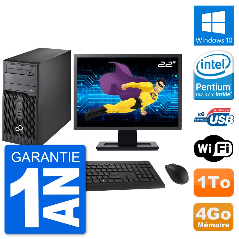 PC Tour Fujitsu P400 - Intel Pentium Dual-Core G630 2.7 Ghz (3 Mo) - 4 Go DDR3 - Disque Dur 3,5" 1 To - Graveur DVD - Clef Wifi USB - Windows 10 - Livré avec Ecran 22" + clavier + souris (Marques et modèles variables) - Garantie 1 an.