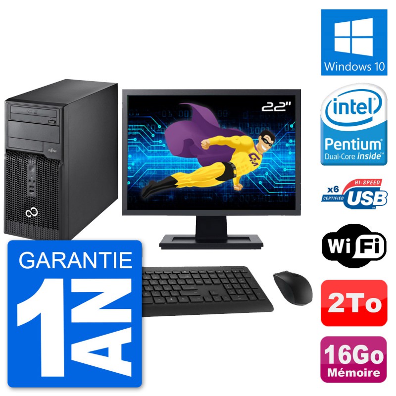 PC Tour Fujitsu P400 - Intel Pentium Dual-Core G630 2.7 Ghz (3 Mo) - 16 Go DDR3 - Disque Dur 3,5" 2 To - Graveur DVD - Clef Wifi USB - Windows 10 - Livré avec Ecran 22" + clavier + souris (Marques et modèles variables) - Garantie 1 an.